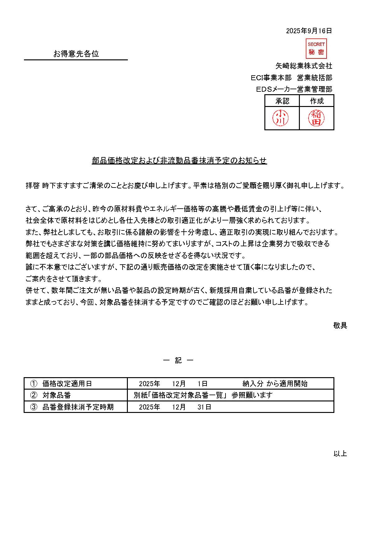 The following is an official notice regarding price increases and the discontinuation (discontinuation) of certain part numbers.