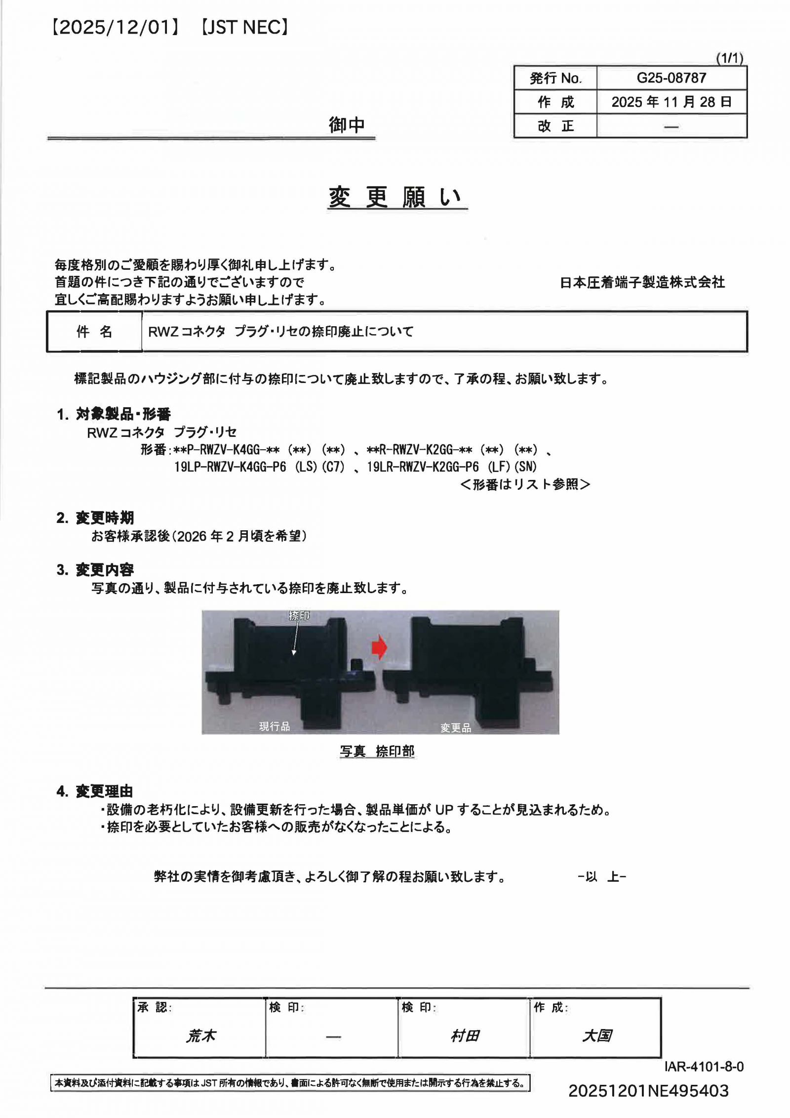 日本壓著端子製造株式會社 (JST) 發出的產品變更申請書,主要內容是關於 RWZ 系列連接器外殼上的「標記(捺印)」將予以取消。